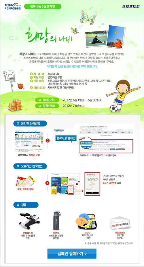 건전한 기부문화 정착을 위해 실시하는 행복나눔 캠페인은 매달 1000만원을 목표로 스포츠토토 팬들의 기부금을 모아 어려운 이웃을 돕는 이벤트다. 6월에 적립된 기부금은 사회복지법인 '어린이재단'과 함께 진행하는 '희망의 나비' 사업에 쓰이게 된다.
