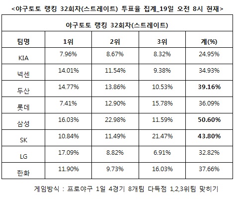 국민체육진흥공단(www.kspo.or.kr)이 발행하는 체육진흥투표권 수탁사업자인 스포츠토토 공식 온라인 발매 사이트인 베트맨(www.betman.co.kr)이 20일 오후 6시 30분에 열리는 2012 프로야구 4경기 8개팀을 대상으로 한 야구토토 랭킹 32회차 스트레이트 게임을 중간집계한 결과, 참가자들은 삼성(50.60%), SK(43.80%), 두산(39.16%) 순으로 다득점 상위 3개팀을 꼽았다. 반면 LG(32.82%)와 KIA(24.95%)는 가장 적은 득점을 기록할 것으로 예상됐다.