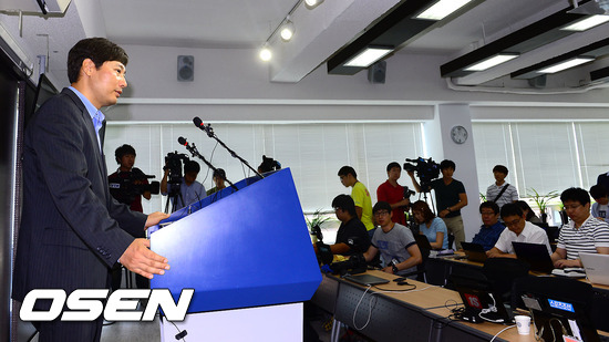 19일 오전 서울 도곡동 야구회관에서 10구단 창단 승인에 대한 임시이사회에서 류대환 홍보지원부장이 10구단 창단 유보를 발표하고 있다.