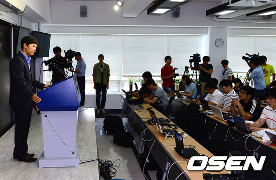 19일 오전 서울 도곡동 야구회관에서 10구단 창단 승인에 대한 임시이사회에서 류대환 홍보지원부장이 10구단 창단 유보를 발표하고 있다.