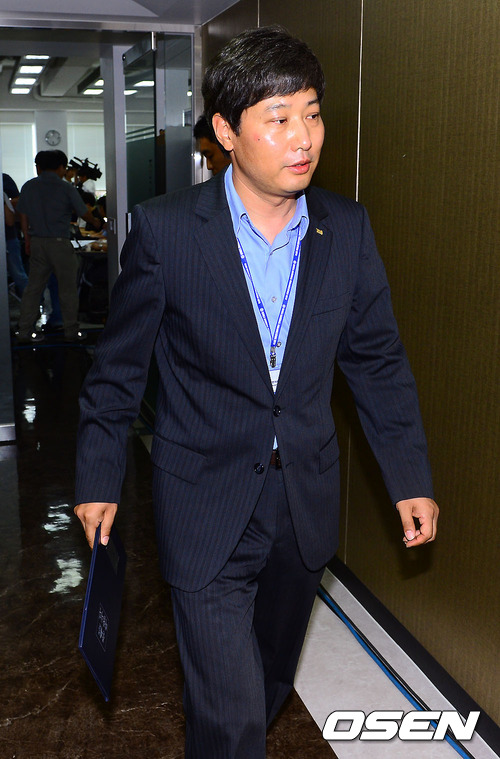 19일 오전 서울 도곡동 야구회관에서 10구단 창단 승인에 대한 임시이사회에서 류대환 홍보지원부장이 10구단 창단 유보를 발표하고 빠져나가고 있다.