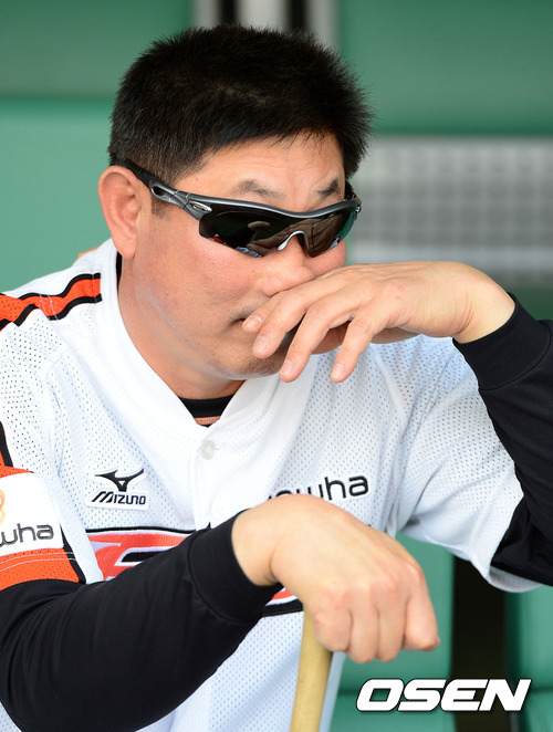 19일 오후 대전구장에서 열린 '2012 팔도 프로야구' 한화 이글스와 LG 트윈스의 경기, 경기에 앞서 한화 한대화 감독이 취재진과 이야기를 나누며 코를 만지고 있다.
