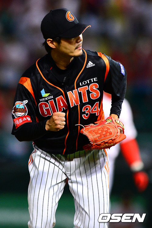 19일 오후 인천 문학구장에서 열린 2012 팔도 프로야구 SK 와이번스와 롯데 자이언츠의 경기 5회말 2사 1,3루 SK 최정을 삼진아웃 잡은 롯데 선발 이용훈이 주먹을 쥐며 환호하고 있다.