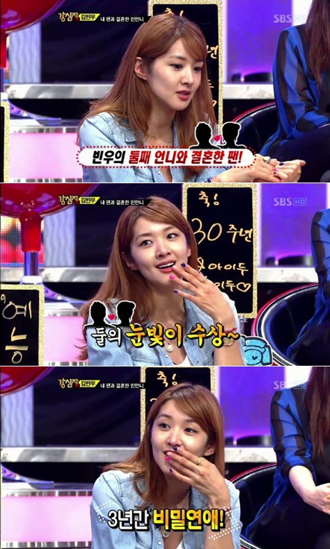 또 김빈우는 "두 사람이 3년간 비밀연애를 하고 결혼한다고 하더라"며 "형부는 나는 팬으로 보고 언니는 여자로 본 것이다"고 덧붙였다.