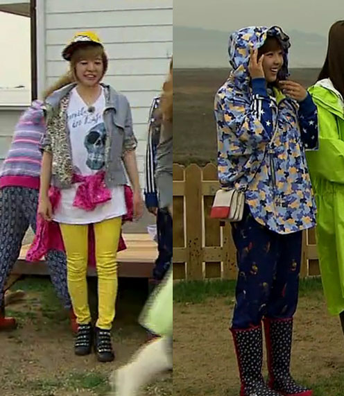 KBS 2 ‘청춘불패’의 소녀시대 써니, 쥬얼리 예원은 깜찍한 우비와 레인부츠로 스타일을 살려냈다. 써니는 옐로우 아이템으로 스타일링에 활력을 불어넣고 핑크컬러에 도트무늬가 곁들여진 바닐라비 우비를 허리에 맸다.