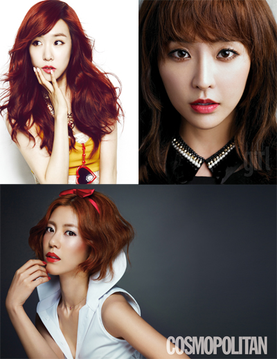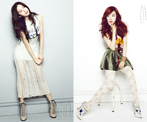 엘르걸 7월호 화보 속 티파니는 레드 컬러 헤어와 레드 립스틱으로 영화 ‘물랑 루즈’의 니콜 키드먼을 연상케 하는 연출을 해 도발적인 매력을 내뿜었다. 반면 정유미는 체리 빛 레드 립스틱과 브라운이 감도는 오렌지 컬러 헤어로 인형처럼 사랑스러운 모습을 완성했다.