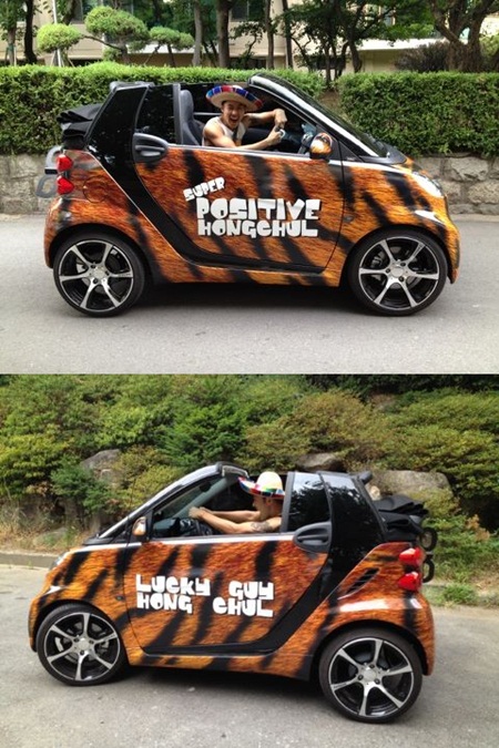 공개된 사진 속에는 노홍철이 귀여운 자동차 안에 앉아 기쁜 표정을 드러내고 있다. 호피무늬로 도색된 차에는 '슈퍼 긍정 홍철', '행운의 사나이 홍철'이라는 뜻의 문구가 새겨져 있어 웃음을 자아냈다. 특히 "오픈 마인드 상기용, 열리는 뚜껑"이라는 글 내용과 오픈카 형태의 차는 묘한 조화를 이뤄 눈길을 끌었다.