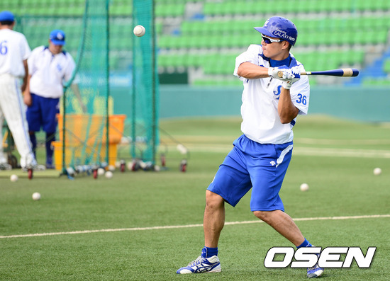 20일 오후 대구야구장에서 열린 '2012 팔도 프로야구' 삼성 라이온즈와 KIA 타이거즈의 경기에 앞서 삼성 이승엽이 수비 훈련하는 동료들을 위해 공을 그라운드로 치고 있다.