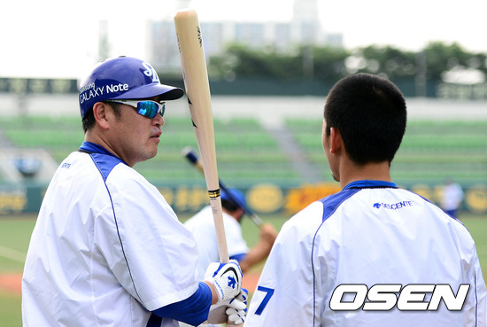 20일 오후 대구야구장에서 열린 '2012 팔도 프로야구' 삼성 라이온즈와 KIA 타이거즈의 경기에 앞서 삼성 진갑용이 김상수의 배트를 살펴보고 있다.