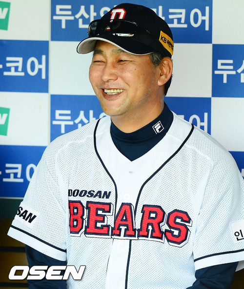 20일 오후 서울 잠실구장에서 '2012 팔도 프로야구' 두산 베어스와 넥센 히어로즈의 경기가 열릴 예정인 가운데 양팀 훈련시간에 두산 김진욱 감독이 환하게 미소짓고 있다.