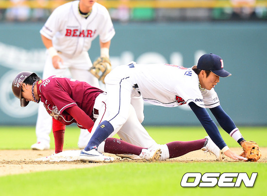 20일 오후 서울 잠실구장에서 열린 '2012 팔도 프로야구' 두산 베어스와 넥센 히어로즈의 경기에서 2회초 2사 1루 넥센 장기영의 도루때 백업 수비에 들어온 두산 허경민과 충돌하고 있다.