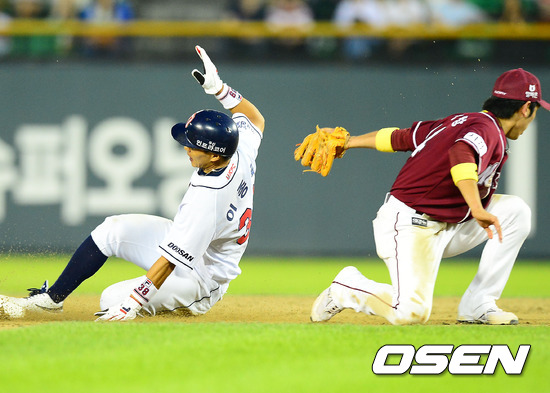 20일 오후 서울 잠실구장에서 열린 '2012 팔도 프로야구' 두산 베어스와 넥센 히어로즈의 경기에서 5회말 2사 주자 1루 두산 김동주 타석에서 1루 주자 이종욱이 2루 도루에 성공하고 있다.