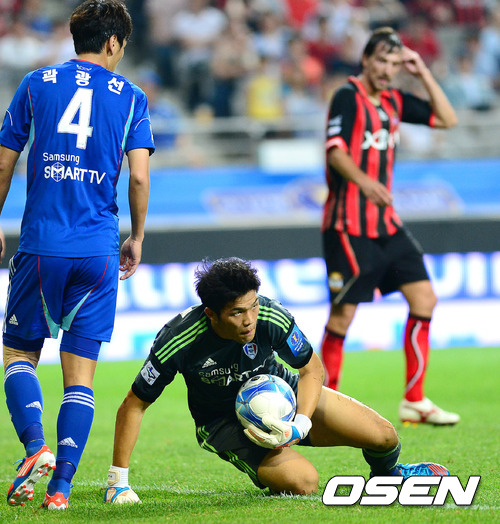 20일 오후 서울월드컵경기장에서 열린 '2012 하나은행 FA컵' 16강전 FC서울과 수원 삼성의 경기 후반 정성룡이 서울의 슈팅을 막아내고 있다.