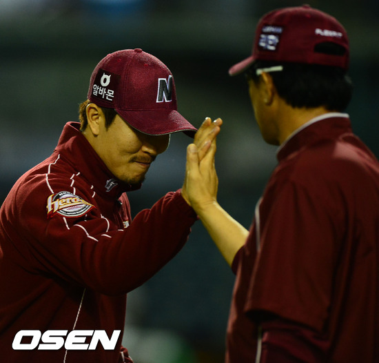 경기를 마치고 김병현이 넥센 김시진 감독과 하이파이브를 하고 있다. / rumi@osen.co.kr