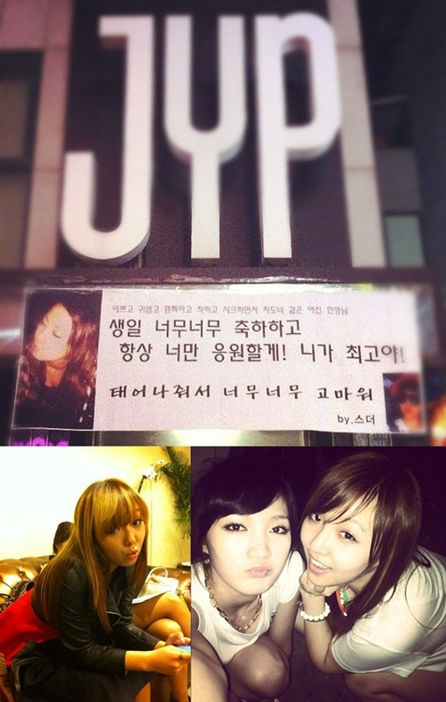 지아는 21일 오전 자신의 트위터에 "베이비 민 생일 축하해(Baby~min~happy birthday!)"라는 글과 함께 사진을 게재했으며, 페이는 지난 20일 오후 자신의 트위터에 "세상에서 제일 귀여운 우리 민영이. 생일 축하해. 너 지금 닭살났지? 알았어. 닭살나는 말 안 할게. 꼭 행복해야 돼 계속... 아무튼 내일 봐"라는 글과 함께 또 다른 사진을 게재했다.