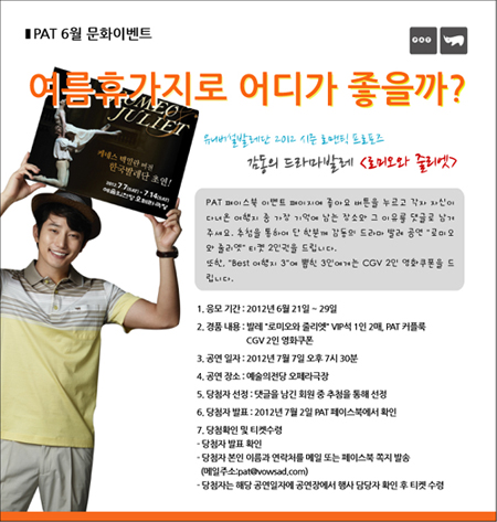 이벤트 사은품으로 가장 좋은 여행지를 추천한 1인에게는 발레 ‘로미오와 줄리엣’ VIP 티켓과 PAT 커플티를 증정한다. 그 외 ‘추천지 Best3’에 뽑힌 3인에게는 영화티켓 기프티콘 2매를 준다. 이들 3인의 추천 여행지는 추후 PAT 블로그에 '여행지 추천‘ 컨텐츠로 포스팅 될 예정이다.