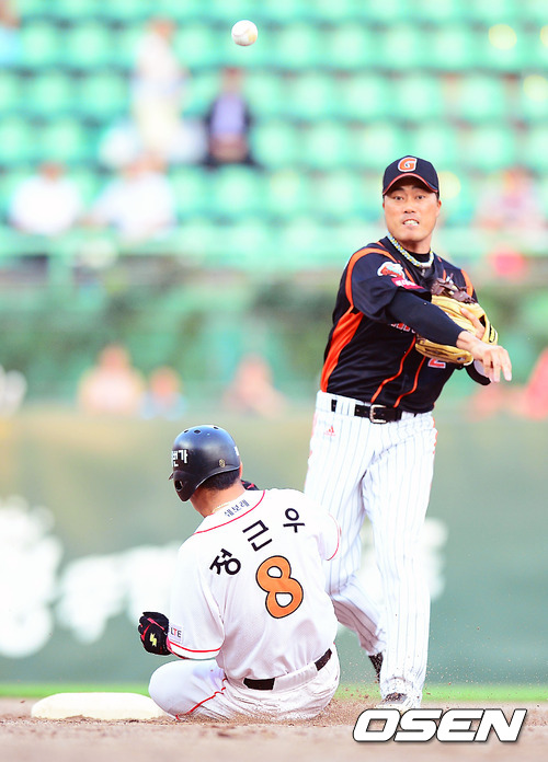 21일 오후 인천 문학구장에서 열린 '2012 팔도 프로야구' SK 와이번스와 롯데 자이언츠의 경기에서 1회말 1사 주자 1루 SK 최정의 유격수 앞 병살타때 롯데 2루수 조성환이 2루에서 정근우를 포스아웃 시킨 후 1루로 송구하고 있다.