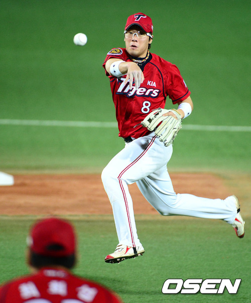 21일 오후 대구야구장에서 열린 '2012 팔도 프로야구' 삼성 라이온즈와 KIA 타이거즈의 경기, 5회말 1사 2루 삼성 박한이의 땅볼 타구를 잡은 KIA 안치홍이 점프를 하며 1루로 송구하고 있다.