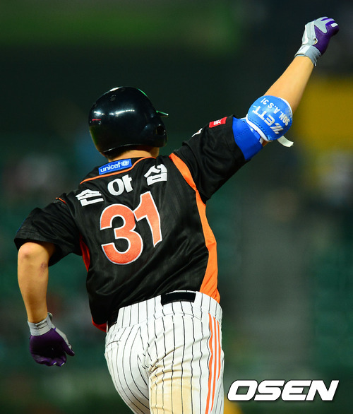 21일 오후 인천 문학구장에서 열린 '2012 팔도 프로야구' SK 와이번스와 롯데 자이언츠의 경기에서 7회초 2사 주자 2루 롯데 손아섭이 우월 투런 홈런을 날린 후 주먹을 쥐고 있다.