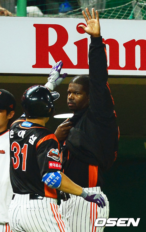 21일 오후 인천 문학구장에서 열린 '2012 팔도 프로야구' SK 와이번스와 롯데 자이언츠의 경기에서 7회초 2사 주자 2루 롯데 손아섭이 우월 투런 홈런을 날린 후 덕아웃에서 유먼과 하이파이브를 하고 있다.