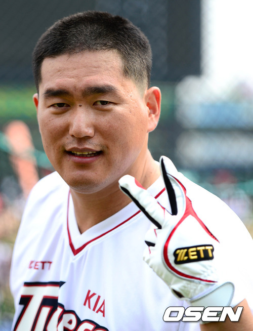 22일 오후 광주야구장에서 열린 '2012 팔도 프로야구' KIA 타이거즈와 SK 와이번스의 경기에 앞서 머리카락을 짧게 자른 KIA 최희섭이 취재진을 향해 포즈를 취하고 있다.