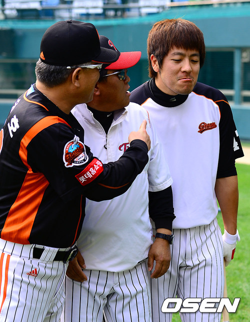22일 오후 서울 잠실구장에서 열리는 2012 팔도 프로야구 LG 트윈스와 롯데 자이언츠의 경기 전 롯데 양승호 감독과 강민호가 LG 김무관 코치와 포즈를 취하고 있다.
