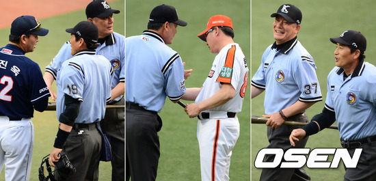 22일 오후 대전구장에서 열린 '2012 팔도 프로야구' 한화 이글스와 두산 베어스의 경기, 1회말 2사 2루에서 한화 김태균의 선제 적시타를 날리자 두산 김진욱 감독이 방망이에 송진 가루가 많이 묻었다며 강광회 구심에게 문제 제기를 하고 있다. 이에 한대화 감독이 나와 항의하고 결국 아무일 없이 일단락됐다.