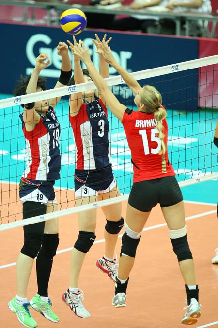 김형실 감독이 이끄는 한국 여자배구 대표팀은 23일 일본 오사카 중앙체육관에서 열린 '2012 월드그랑프리' 3주차 2차전 독일과 경기서 세트스코어 0-3(10-25, 14-25, 20-25)으로 완패했다. 한국은 지난 22일 터키전 패배에 이어 2연패로 1승 7패를 기록했다.
