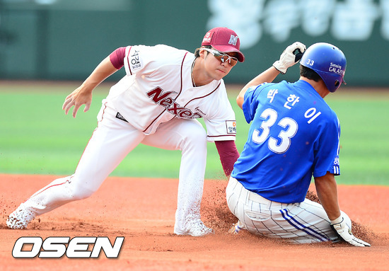 23일 오후 서울 목동구장에서 열린 '2012 팔도 프로야구' 넥센 히어로즈와 삼성 라이온즈의 경기에서 1회초 1사 주자 1루 삼성 박석민 타석에서 1루 주자 박한이가 2루 도루를 시도, 2루에서 유격수 김민성에게 태그아웃 당하고 있다.