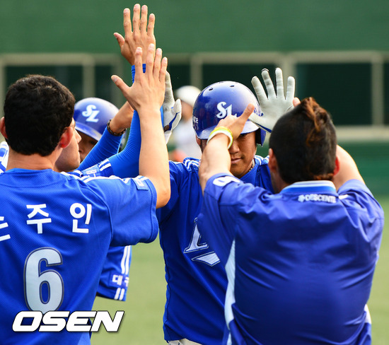 23일 오후 서울 목동구장에서 열린 '2012 팔도 프로야구' 넥센 히어로즈와 삼성 라이온즈의 경기에서 4회초 무사 주자 1루 삼성 박석민이 중월 역전 투런 홈런을 날린 후 덕아웃에서 동료들과 기쁨을 나누고 있다.