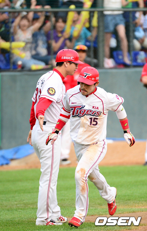 23일 오후 광주야구장에서 열린 '2012 팔도 프로야구' KIA 타이거즈와 SK 와이번스의 경기, 5회말 1사 2루 KIA 이용규가 우월 투런 홈런을 날리고 김종국 코치와 하이파이브를 하고 있다.