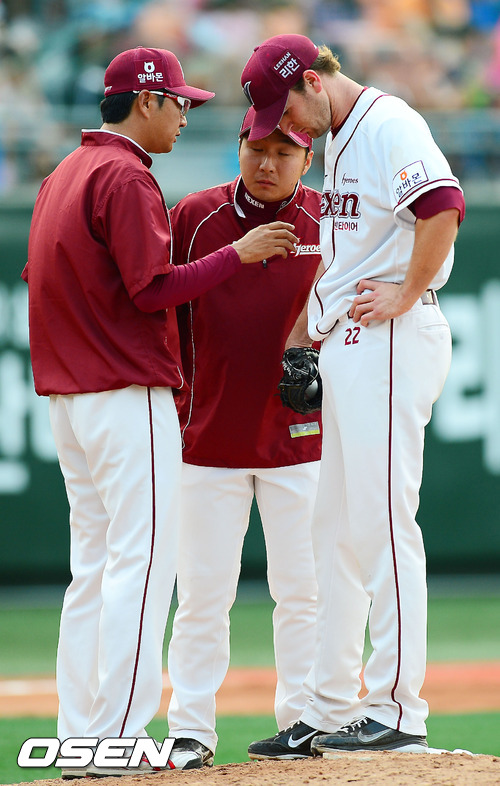 23일 오후 서울 목동구장에서 열린 '2012 팔도 프로야구' 넥센 히어로즈와 삼성 라이온즈의 경기에서 4회초 2사 주자 1,2루 넥센 정민태 투수 코치가 밴헤켄에게 다가가 말을 하고 있다.