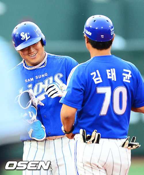 23일 오후 서울 목동구장에서 열린 '2012 팔도 프로야구' 넥센 히어로즈와 삼성 라이온즈의 경기에서 6회초 2사 주자 만루 삼성 박석민이 좌익수 왼쪽 2타점 적시타를 날린 후 2루에서 김태균 코치와 하이파이브를 하고 있다.