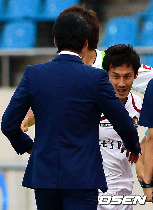 23일 오후 성남 탄천 종합운동장에서 열린 '현대오일뱅크 K리그 2012' 성남 일화와 대전 시티즌의 경기, 전반 대전 김형범이 추가골을 넣고 유상철 감독과 기뻐하고 있다.