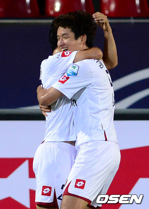 23일 오후 성남 탄천 종합운동장에서 열린 '현대오일뱅크 K리그 2012' 성남 일화와 대전 시티즌의 경기, 후반 대전 김태연이 추가골을 넣고 김형범과 기뻐하고 있다.