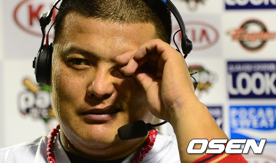 경기후 한화 김태균이 방송 인터뷰 도중 눈에 빗물이 들어가자 닦아내고 있다. /jpnews@osen.co.kr