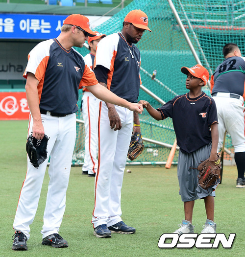24일 오후 대전구장에서 열린 '2012 팔도 프로야구' 한화 이글스와 두산 베어스의 경기, 경기전 한화 바티스타의 9살 난 아들 데이미가 션 헨과 인사를 하고 있다.
