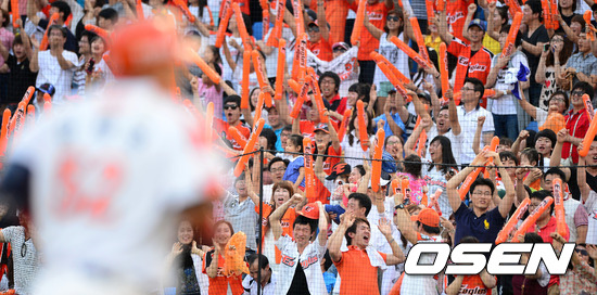 24일 오후 대전구장에서 열린 '2012 팔도 프로야구' 한화 이글스와 두산 베어스의 경기, 7회말 무사 1,3루에서 한화 김태균이 스리런 홈런을 날리자 팬들이 열광하고 있다.