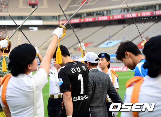24일 오후 서울월드컵경기장에서 열린 '2012 K-리그' 17라운드 FC 서울과 울산 현대의 경기 전반 선수들이 숙명여대 학도호국단 사이로 입장하고 있다.