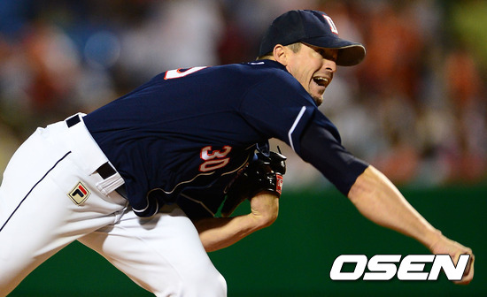 24일 오후 대전구장에서 열린 '2012 팔도 프로야구' 한화 이글스와 두산 베어스의 경기, 10회말 무사 1루에서 마운드에 오른 두산 프록터가 역투하고 있다.
