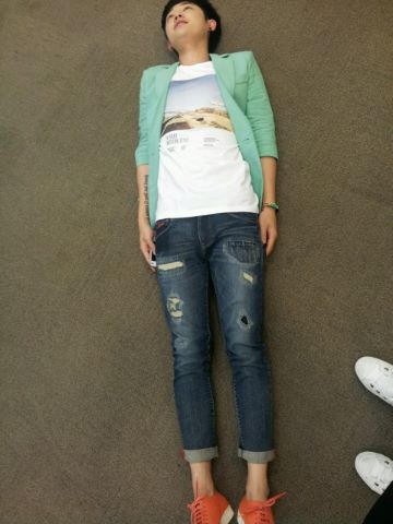 공개된 사진 속에는 김형태는 에메랄드 색깔의 재킷에 스키니 청바지로 귀여우면서도 산뜻한 분위기를 풍겼다. 그는 글 내용에서 알 수 있듯이, 사진을 찍어야하는 상황에서 바닥에 일자로 눕는 포즈를 취해 웃음을 자아냈다.