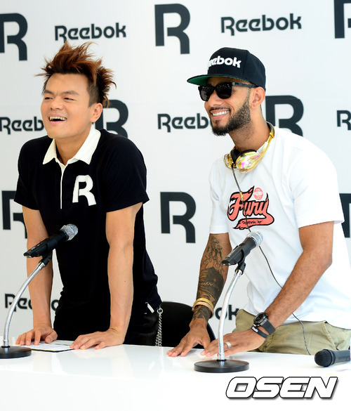 26일 오후 서울 강남 레스모아 매장에서 진행된 리복 '2012년 하반기 새로운 클래식 캠페인'기자회견에서 박진영과 스위즈 비츠가 취재진의 질문을 듣기 위해 일어서고 있다.