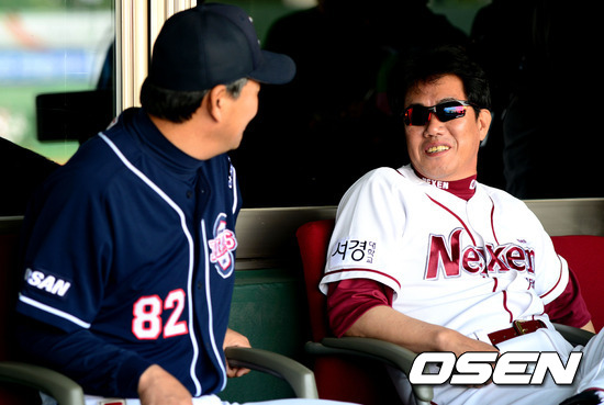 26일 서울 목동구장에서 열린 '2012 팔도 프로야구' 넥센 히어로즈와 두산 베어스의 경기전 두산 김진욱 감독과 넥센 김시진 감독이 이야기를 나누고 있다.