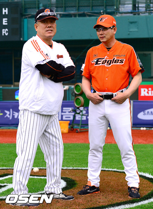 26일 오후 부산 사직구장에서 열리는 2012 팔도 프로야구 롯데 자이언츠와 한화 이글스의 경기 전 롯데 양승호 감독과 한화 한대화 감독이 이야기를 나누고 있다