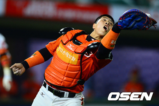26일 오후 부산 사직구장에서 열린 2012 팔도 프로야구 롯데 자이언츠와 한화 이글스의 경기 6회말 1사 만루 롯데 강민호의 파울타구를 한화 정범모 포수가 놓치고 있다.
