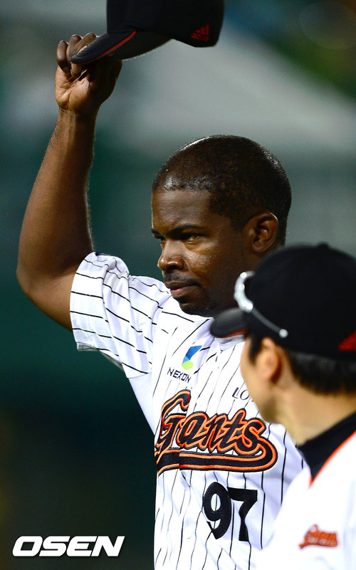 26일 오후 부산 사직구장에서 열린 2012 팔도 프로야구 롯데 자이언츠와 한화 이글스의 경기 7회초 롯데 최대성과 교체된 선발투수 유먼이 팬들에게 인사를 하며 더그아웃으로 들어가고 있다. 유먼은 이날 6⅔이닝 무실점 기록했다.
