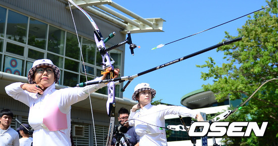 여자 대표팀 이성진, 기보배가 활을 쏘고 있다.