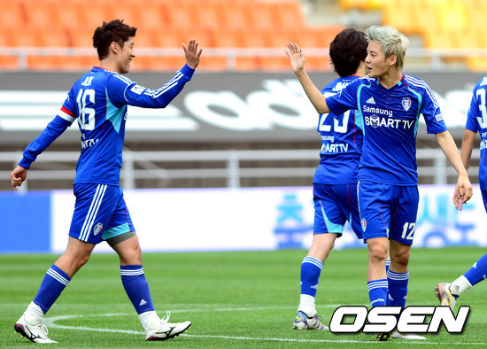27일 오후 수원월드컵경기장에서 열린 연예인 축구팀 FC MAN과 수원 서포터스와의 친선경기 FC MAN 김준수와 이지석이 기뻐하고 있다.