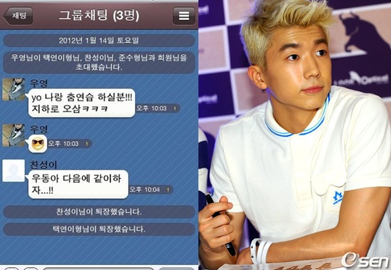 공개된 사진에는 장우영이 멤버들과 주고 받은 문자 내용이 담겨 있다. 장우영은 단체 채팅방을 개설해 택연, 찬성, 준수, 준호를 초대한 뒤 '나랑 춤 연습 하실 분! 지하로 오삼'이라는 메시지를 보냈다.