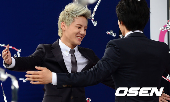 김준수와 김재중이 커팅식을 마치고 포옹을 하고 자축하고 있다.